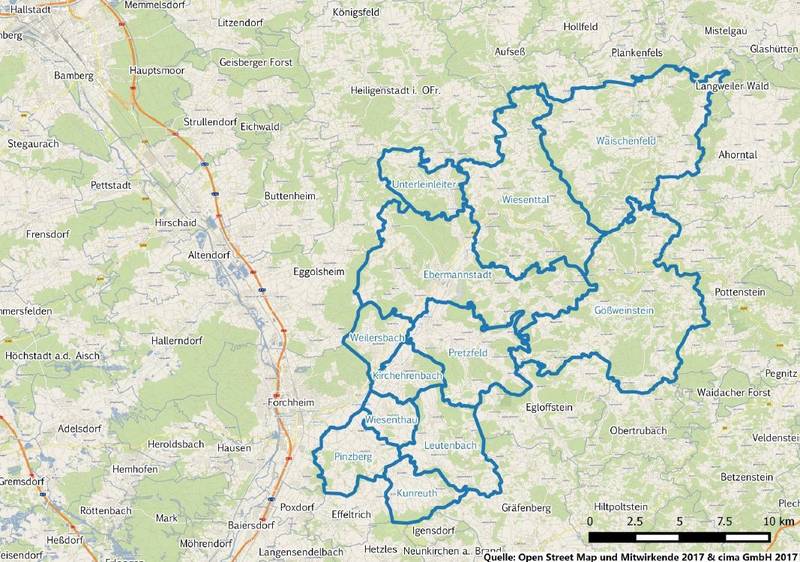 Überwiegend im nordöstlichen Teil des Landkreises Forchheim – ergänzt durch die Stadt Waischenfeld (Landkreis Bayreuth), im Osten befindet sich das Wirtschaftsband A9 mit 18 Mitgliedsgemeinden, im Norden die ILE „Rund um die Neubürg“ mit 10 Mitgliedsgemeinden, im Westen die ILE „Regnitz-Aisch“ mit 4 Mitgliedsgemeinden In Oberfranken derzeit 12 Integrierte Entwicklungen mit etwa 90 Gemeinden.